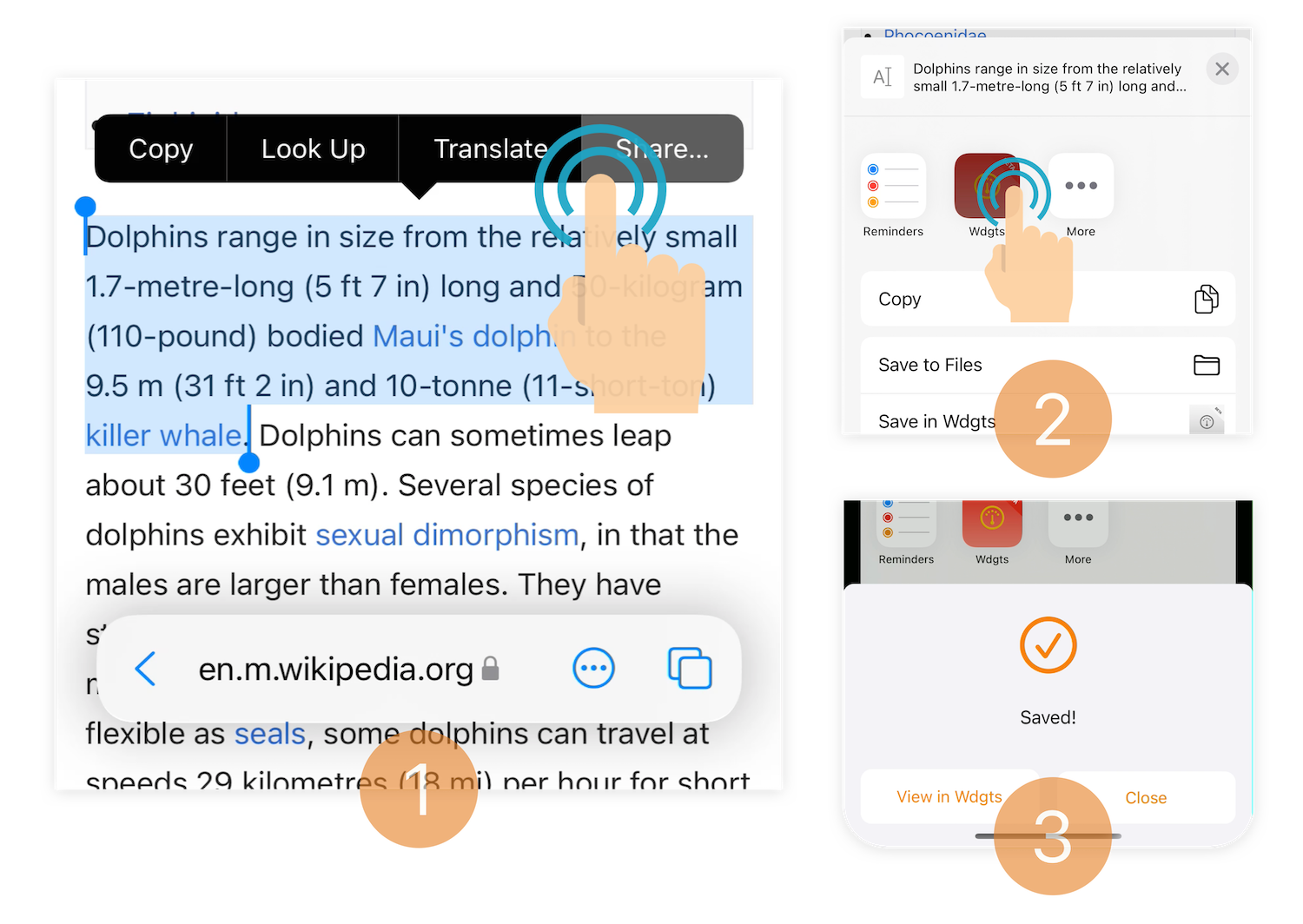 Saving a clip from anywhere is as easy as Select Text > Share > Wdgts > Done.