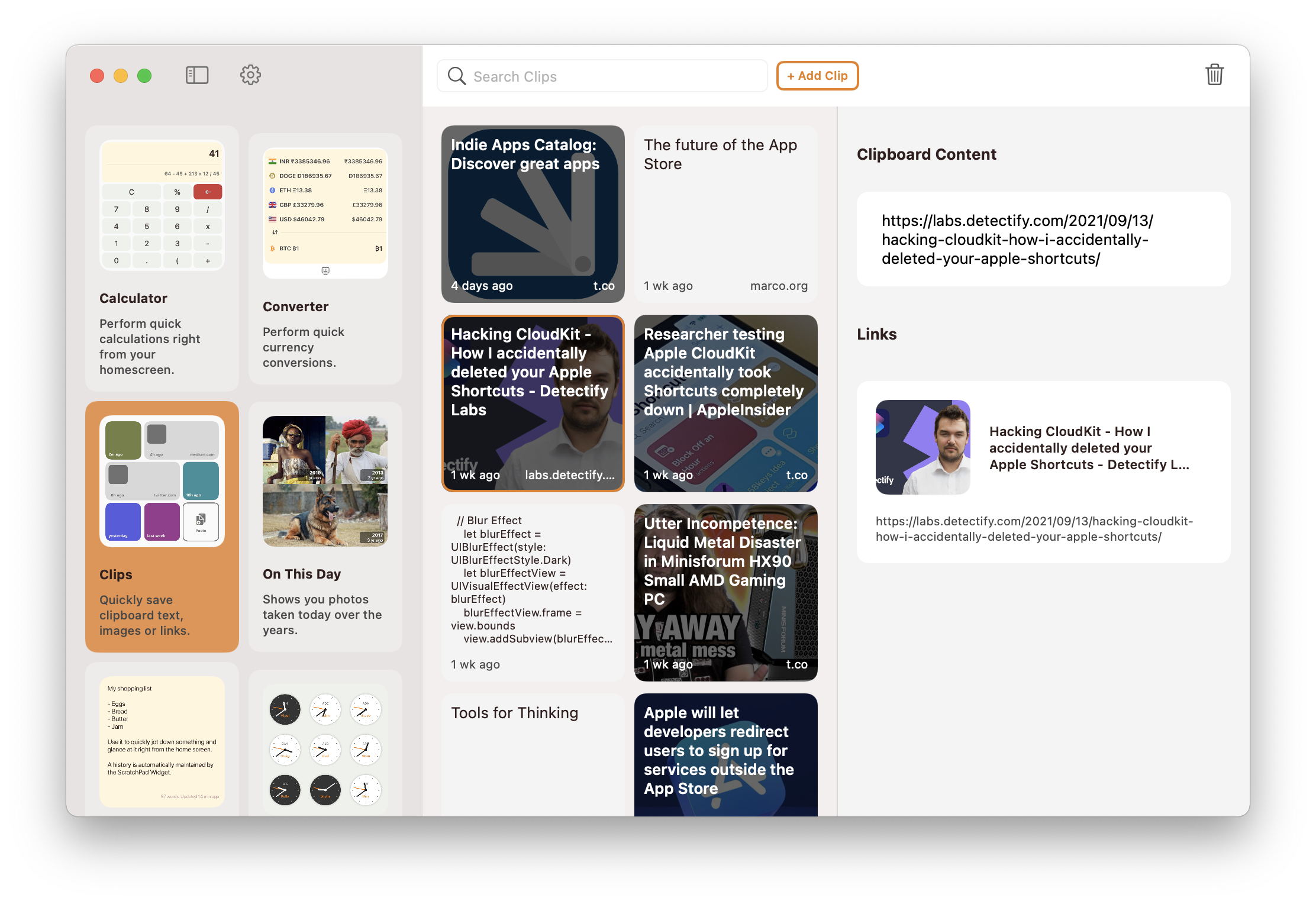 Each widget is a full fledged app with it's own iCloud sync, search, history, action extensions and more.